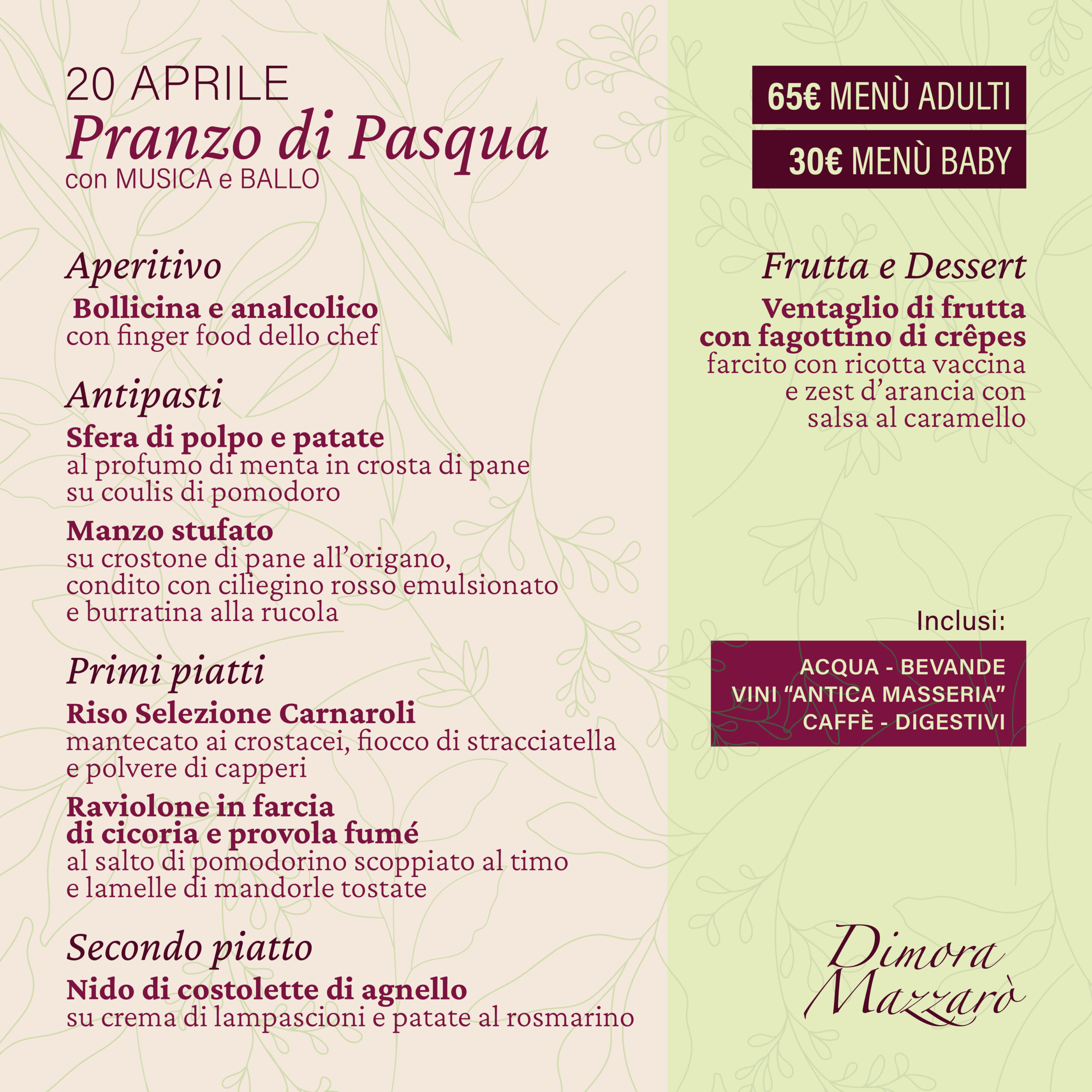 Mercoledì 1 gennaio 2025 | Pranzo di Capodanno | Adulti 65, Bambini 30