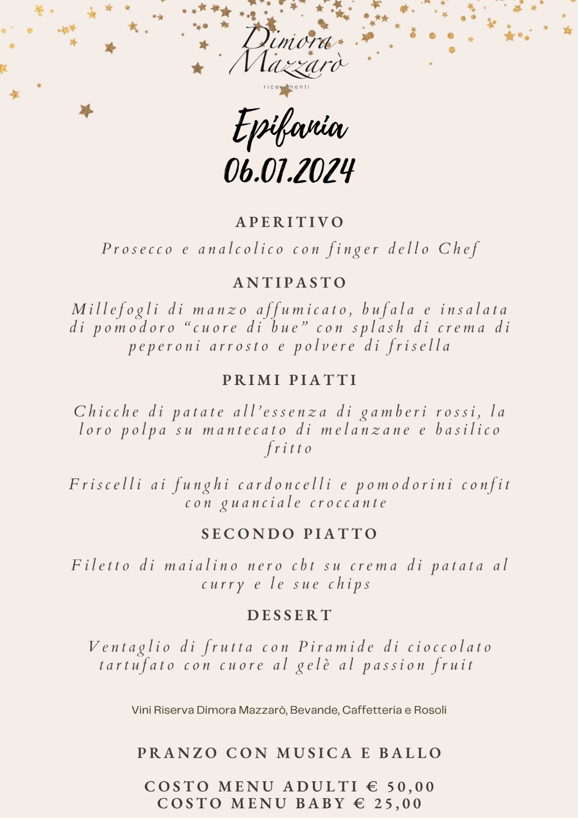 Pranzo Epifania P r a n z o E p i f a n i a Novembre 21, 2023 ✦ Ristorante Facebook WhatsApp Telegram Pranzo con musica e ballo Sabato 06 Gennaio 2024 Adulti: 50€ Bambini: 25€ Pranzo Epifania 2024Per chiudere al meglio le festività Natalizie. Scarica il Menu antica masseria Richiedi informazioni Tel: (+39) 3401535237 hotel@antica-masseria.it Nome Cognome Email Cellulare Messaggio Accettazione * A seguito dell’ informativa ricevuta fornisco il consenso al trattamento dei miei dati personali. Questo sito è protetto da reCAPTCHA e si applicano la Privacy Policy e i Termini del Servizio di Google. Invia PrecedentePreviousPranzo di Capodanno NextPranzo delle PalmeSuccessivo